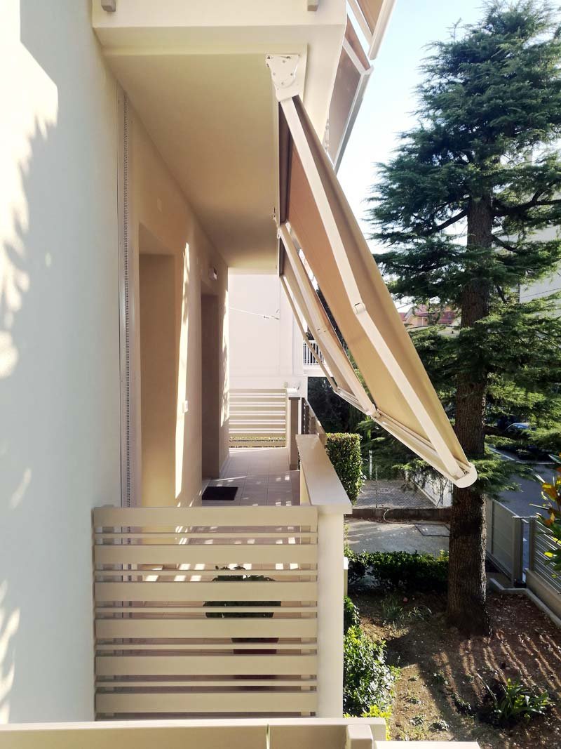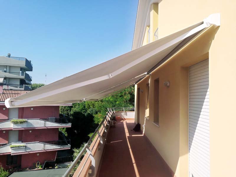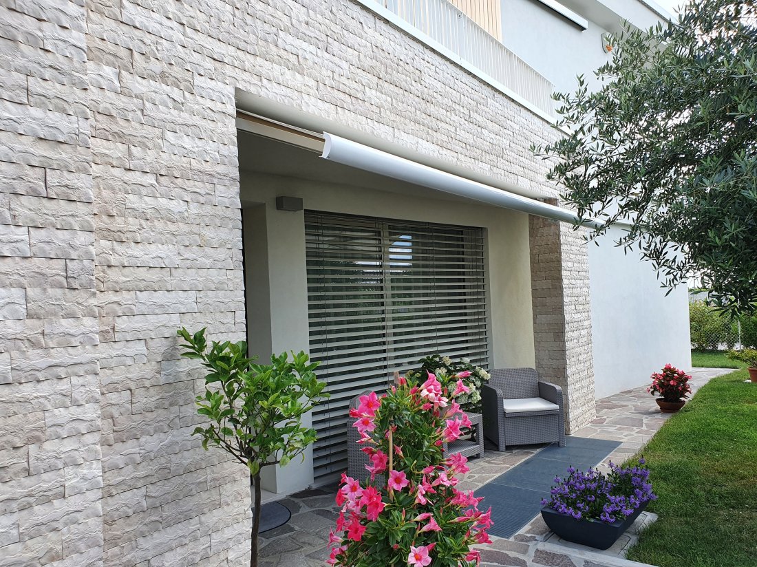 Movimentazione: manuale ad argano con asta, a richiesta con motore a pulsante o con radiocomando e integrabile con sistemi di protezione per il vento, sensore crepuscolare o sensore pioggia.