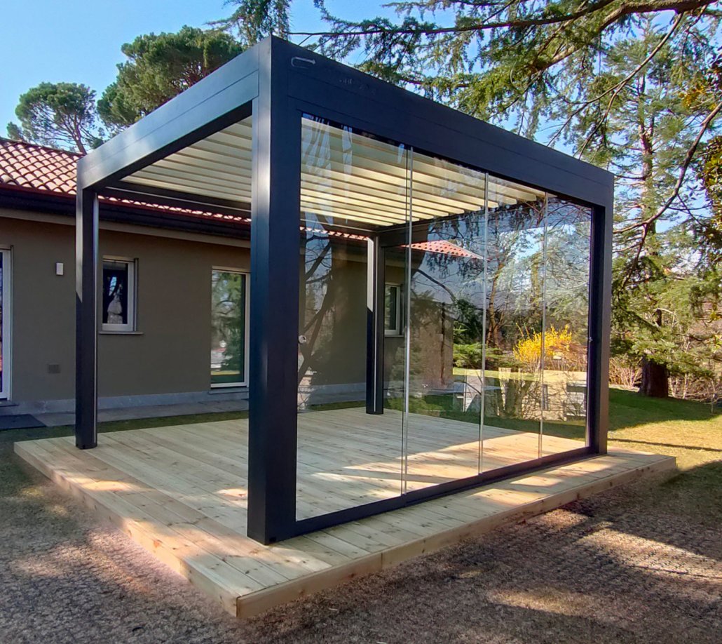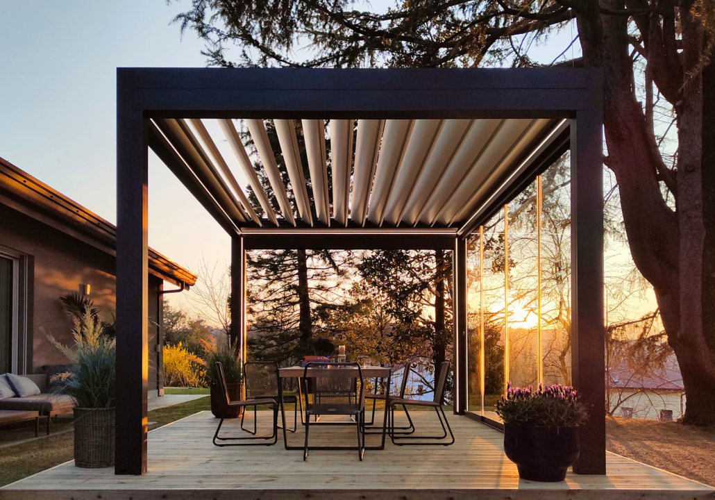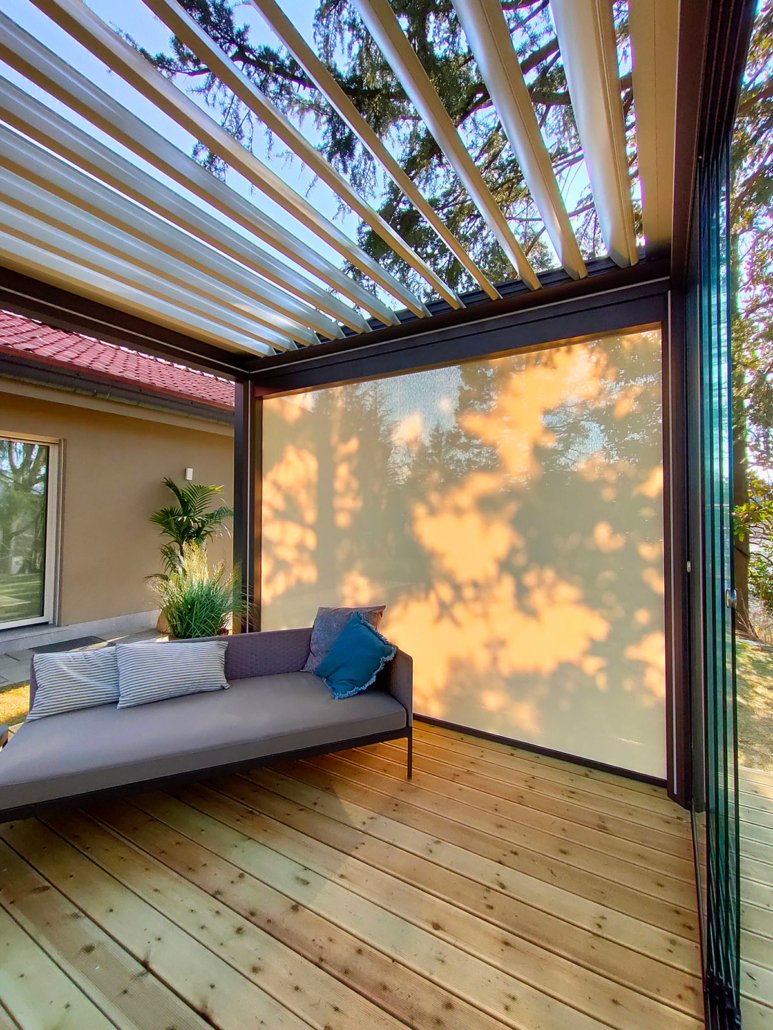 Configurando la pergola con l’aggiunta di vetrate scorrevoli oppure con il sistema di schermatura solare Evo Zip, è possibile completare la protezione anche lungo i lati della struttura, per godere al meglio degli spazi esterni anche nei periodi più freddi dell’anno.